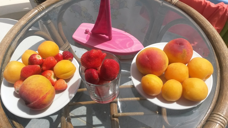 Частенько наведывались за клубникой, а однажды с "девчонками" и моими мужчинами поехали после обеда, купили каких-то сувениров, забрели в ресторанчик на набережной, пили домашнее белое вино, ели жареный сыр, порадовал фраппе (холодный кофе с молоком и сахаром, можно и без), болтали - такие вот посиделки, приятно вспомнить! Отыскали детскую площадку (кстати, они теперь на острове повсюду, что радует) - ребенок поиграл, а мы пошопились в Корфуре (Carrefour) - сеть супермаркетов - здесь все можно купить дешевле, чем в лавках: оливки и оливковое масло, конфеты, клубнику, соки и воды, молочную продукцию и мелкие нужности, типа батареек, "мыльно-рыльных" принадлежностей, подгузников, детского питания и пр.