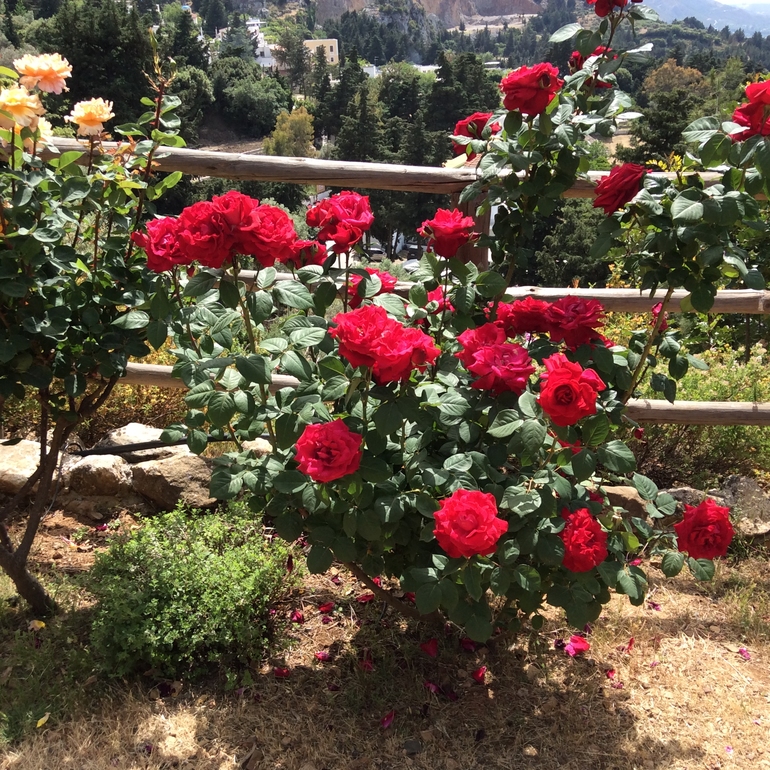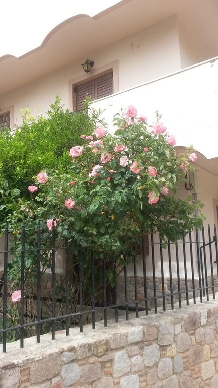 Традиционно, зашли в церковь на вершине горы (идти нужно направо от развилки), полюбовались домиками в цветущих розовых кустах,