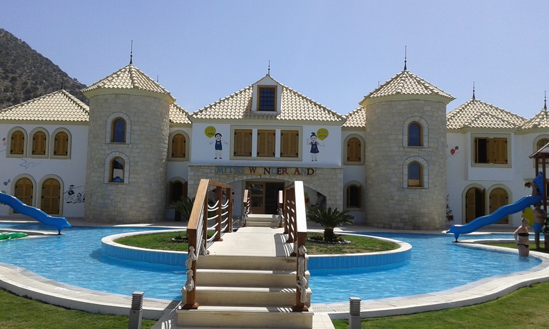 Хочу отметить, что мы могли пользоваться территорией четырех отелей МИТСИС: Саммер палас, Фемили виладж, Норида бич и Блю домс. Везде можно гулять, плавать и пользоваться барами. А самое главное - детским клубом в Блю домс - великолепным зАмком, который открыт с 10.00 до 22.00ч, работают две Ани - девочки-аниматоры, наши соотечественницы, очень ответственные, внимательные и дружелюбные. Заполнив необходимые документы, вы можете оставить своего ребенка в клубе, где его будут развлекать активными играми,творчеством, угощать мороженым и т.д. Клуб окружен причудливой формы детским бассейном, есть горки и качели, вечером работает каруселька. Детский клуб двухэтажный, наверху комната с телевизором, чем-то там еще, а внизу: комната для творчества, игровая, туалетные комнаты, комната аниматоров (есть аптечка), комната с лабиринтом-лазалками. Детей не кормят, родители сами водят своих чад на обед и ужин.