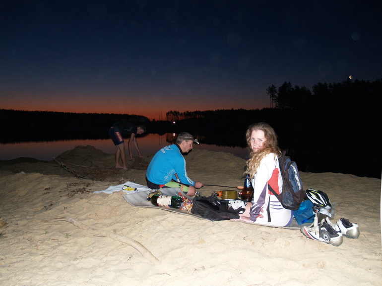 Отоварившись в круглосуточном АТБ, огородами выехали из города и вот тут началось самое интересное! Лесные тропы с торчащими корнями деревьев, крутые спуски и подъемы, подмытые колеями, топкие тропы среди болот, покрытые мокрой травой, пески, камни, чье-то падение каждые несколько минут!