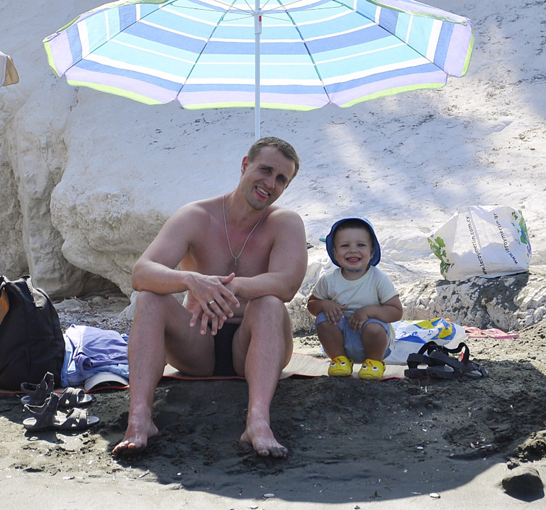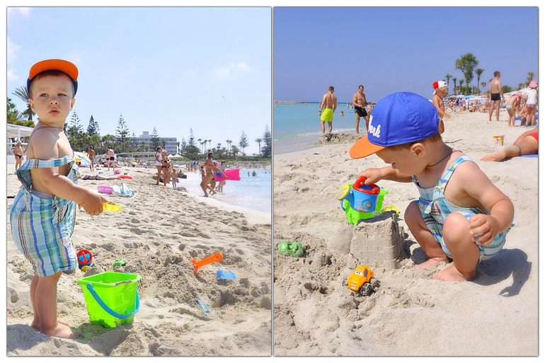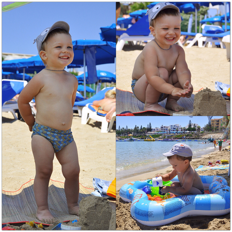 4й- 1 июля поехали на самый популярный пляж Кипра - Ниси бич. Красиво, практически белый песок, голубое море. Но там плавали водоросли в большом количестве :( Потом, пока Ярослав спал, съездили в Jambo, купили зонт для пляжа за 6 евро и подстилку за 2,5, а также игрушки для Ярослава.