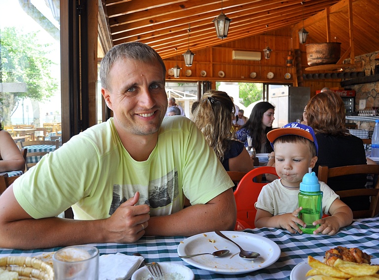 В Ясин сон поехали в сторону Лимассола. В планах было где нибудь покушать и искупаться, а также набережная и раскопки. В интернете прочитала хорошие отзывы о кафе У Панайотиса на Губернаторском пляже. Там и пообедали. Очень приятное место, покушали рыбное мезе от шеф повара за 30 евро на двоих. И еще в презент было кофе, арбуз, желе для Ярослава.
