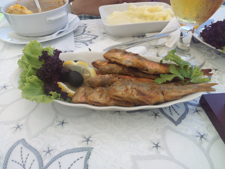 , Температура воздуха 30 градусов,море 22-24 - не сказать ,что теплое,воздух чистый и свежий,духоты вообще не ощущалось! Это мой первй обед вставился)) Местная барабулька - как же ее не попробовать))ММММ вкуснотища))