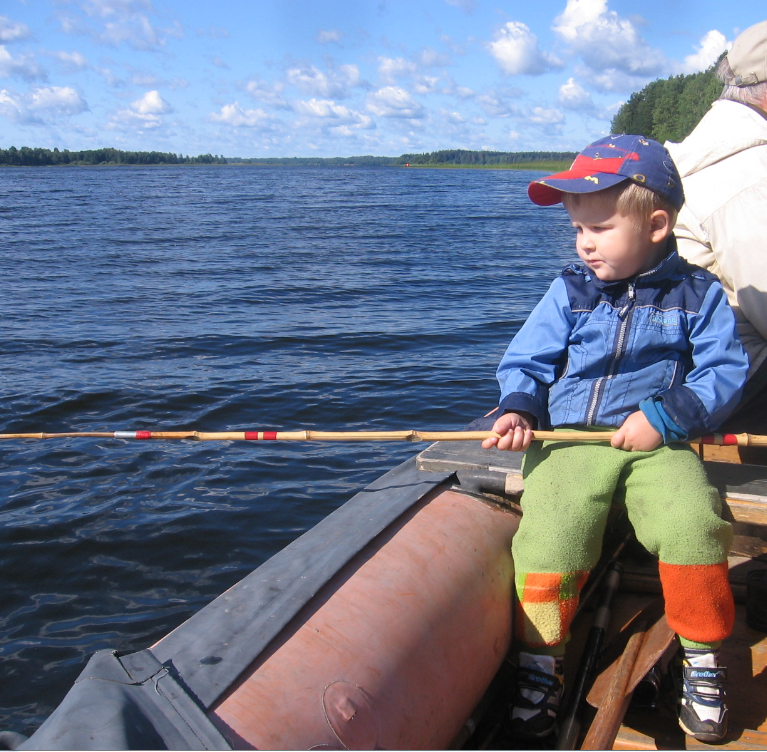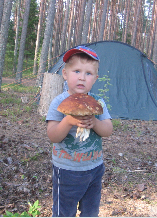 В этом году рыба почему-то клевала плохо, зато было много ягод и грибов, за которыми ходить далеко не надо было: росли прямо рядом с палаткой. Миша наелся ягод, очень полюбил собирать грибы. Некоторые грибы, растущие рядом, мы даже выращивали: замечали и поливали пару дней, чтобы они подросли. Побывали у истока Волги, на Серебряном озере.