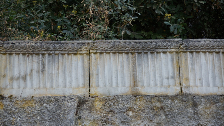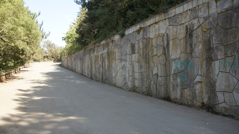 Сейчас часть тропы заасфальтирована, это было сделано при строительстве санатория. Под асфальтом лежит булыжная дорога, вымощенная при Раевском. Дорога ведет на гору и выходит в "Артек" и Гурзуф. Можно пешком и сейчас пройти. Через саму гору дорога, конечно, не асфальтирована). Декоративный бортик вдоль дороги в античном стиле: