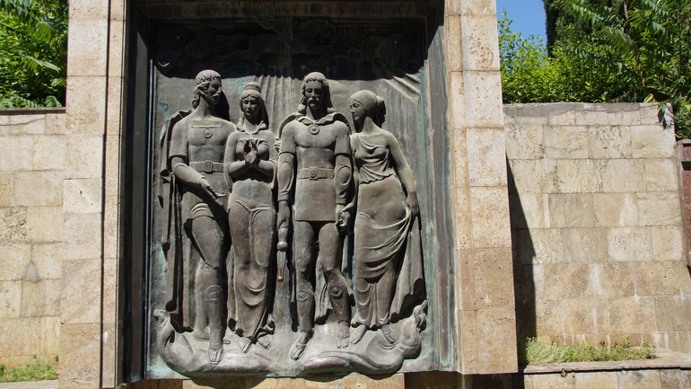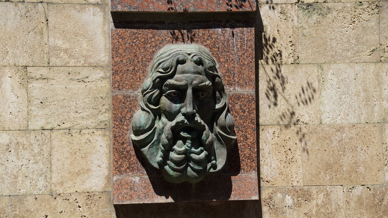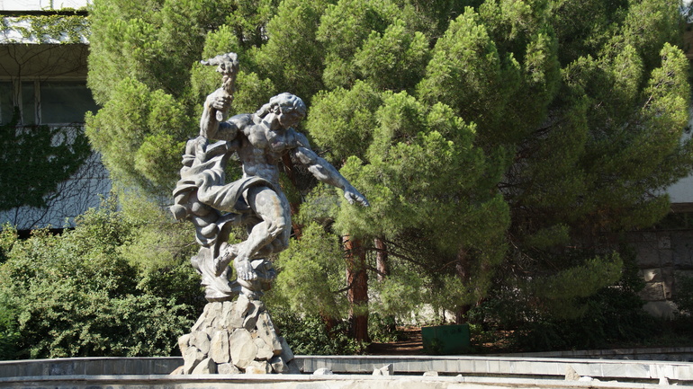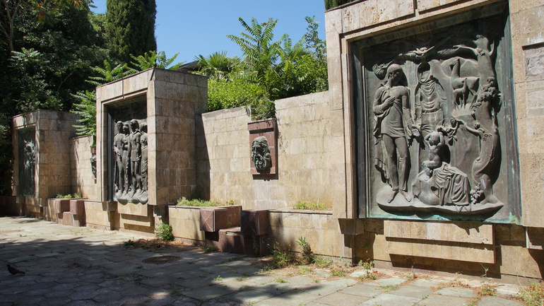 В санатории много фонтанов, фонтанчиков и фонтанищ. Например, вот такой в греческом стиле с изображением мифологических картин. Не работает, увы. Металл зеленеет.((