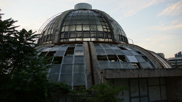 "Зимним садом" перестали заниматься, как я поняла, еще в 90-ые годы. Над зданием потрудились вандалы, разбили стекла... Вход туда закрыт, дверь опечатана, но заглянуть внутрь можно: зрелище жутковатое, как после ядерного взрыва. Но и сейчас сохранились извилистые дорожки, внутри растут пальмы и еще какие-то деревья.