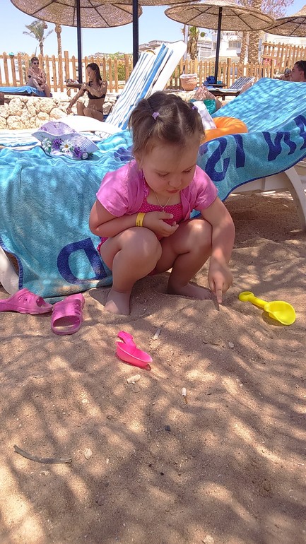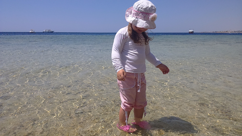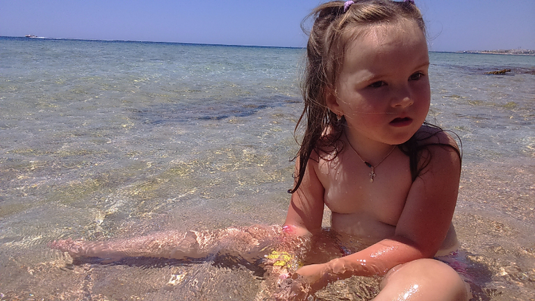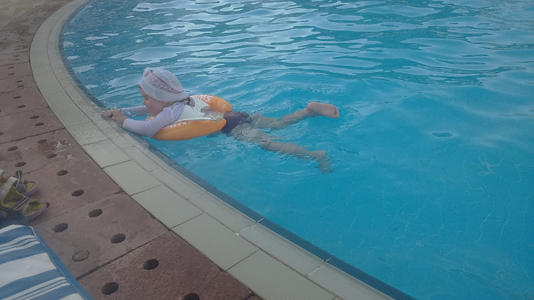 У Элины был круг свимтрейнер. В нем она уплывала вперед меня, отнимала у меня очки и смотрела рыбок. Ей очень понравилось, что вокруг так много рыб и они не уплывают. К сожалению, фото в море у нас нет, так как водный чехол я не купила.. Очень жаль.