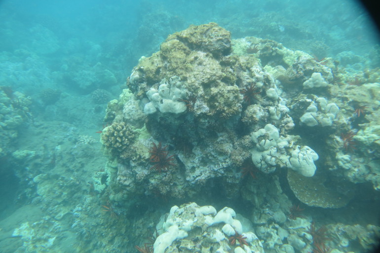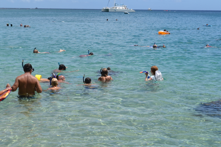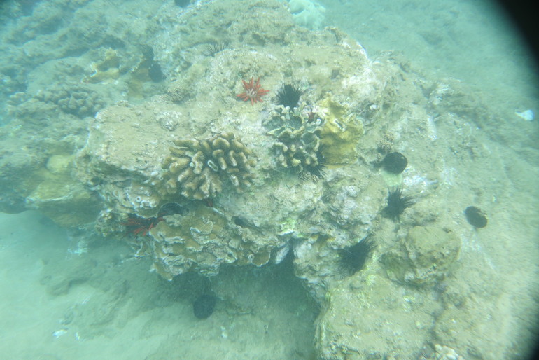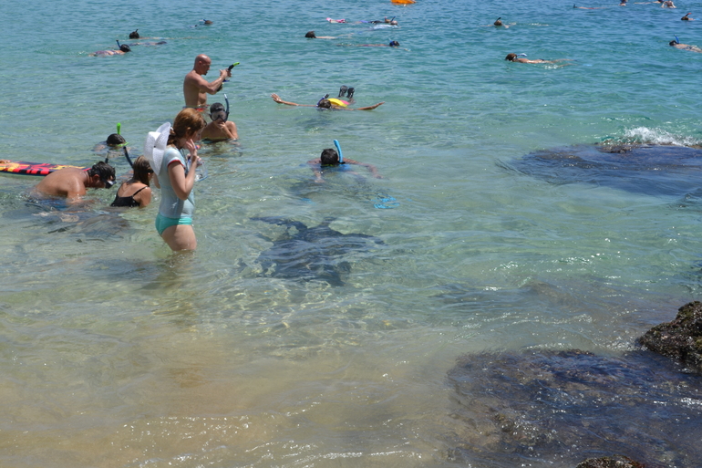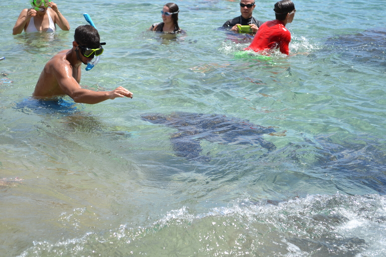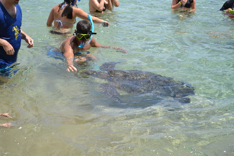 Народу у подножия было много, кто-то прыгал со скалы в воду, кто-то просто плескался, но основная масса снорклила. Под водой красота - всевозможные рыбки сновали между кораллами, морские звезды, еще какая-то живность. Мы попытались оплыть скалу, но с другой стороны сильные волны и ничего особенного, поэтому вернулись. И тут я вижу, много народа куда-то суматошно плывет, я заинтересовалась и двинула за ними. Оказалось, на пляж приплыла большая морская черепаха. Трудно описать наш щенячий восторг, с которым мы тусили рядом с ней. Такого счастья мы даже помыслить не могли, что встретим черепах. Позже приплыла еще одна, покрупнее первой.![]()
