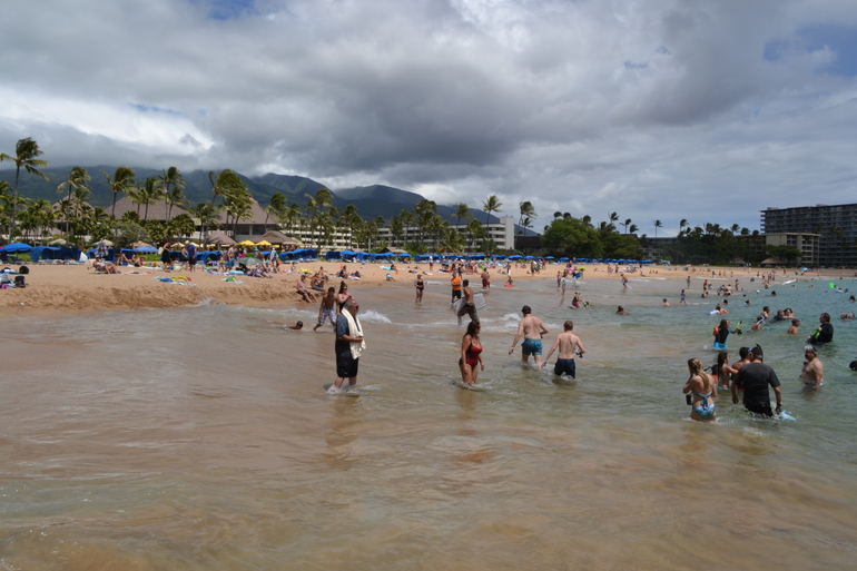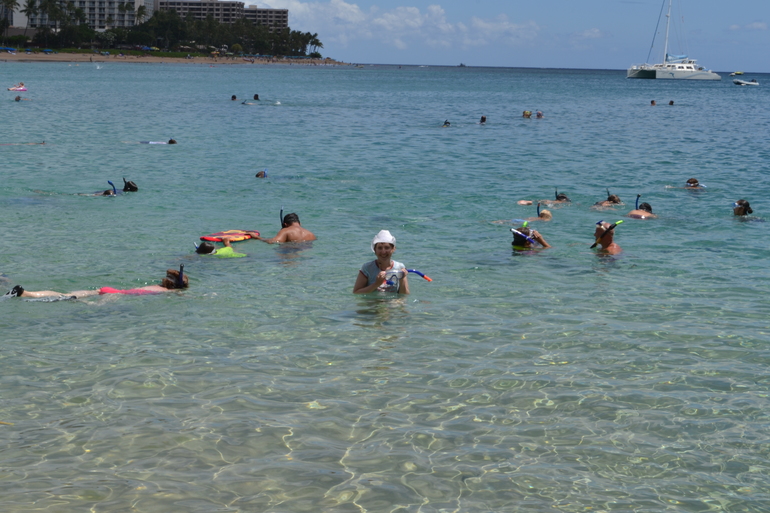Снорклинг у Черной скалы - один из самых лучших на западном Мауи. Оставив машину на стоянке, пошли вдоль пляжа со стороны гостиницы "Шератон". Жарища невозможная, по песку без обуви передвигаться не реально, ноги обжигало.