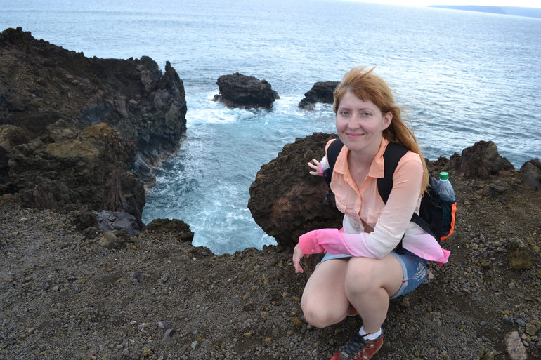 Мы долго шли без цели среди лавы, было очень жарко, не смотря на облачность…. И я уже не видела смысла в дальнейшем походе, но муж меня все тащил вперед. В итоге мы вышли на красивый обрыв, где по-настоящему ощущалось, что здесь КРАЙ ЗЕМЛИ….![]()
