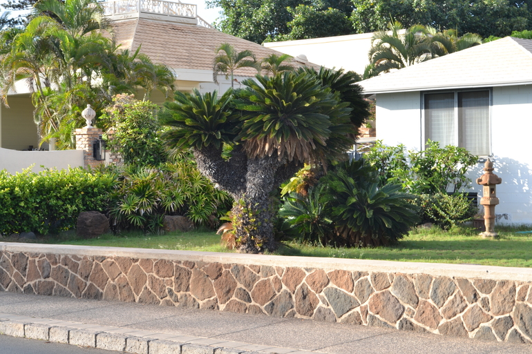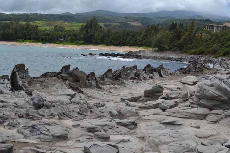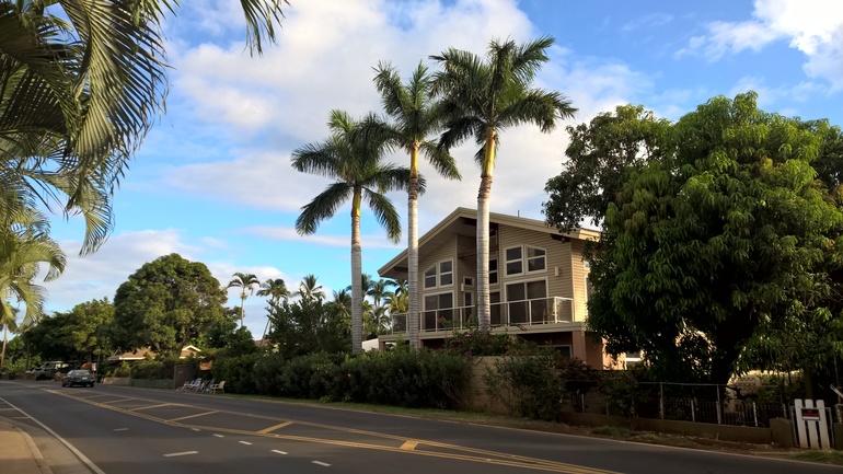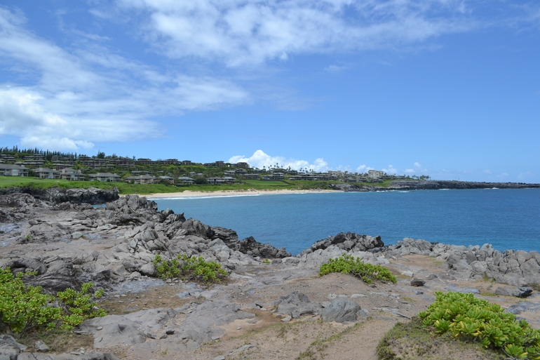 Дальше мы заехали в Napili полюбоваться на "зубы дракона". Сразу за 30-м маркером, влево от основной дороги, отходит тенистая аллея Office rd. Метров через 300 она разветвляется, пуская левую ветвь к гостиницам, а правую - к огромной ухоженной лужайке возле отеля Ритц - Карлтон. На её краю мы обнаружили маленькую стоянку. Поставив машину, отправились на прогулку в сторону моря.