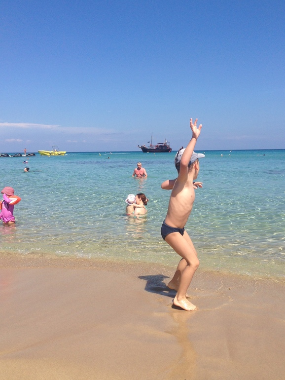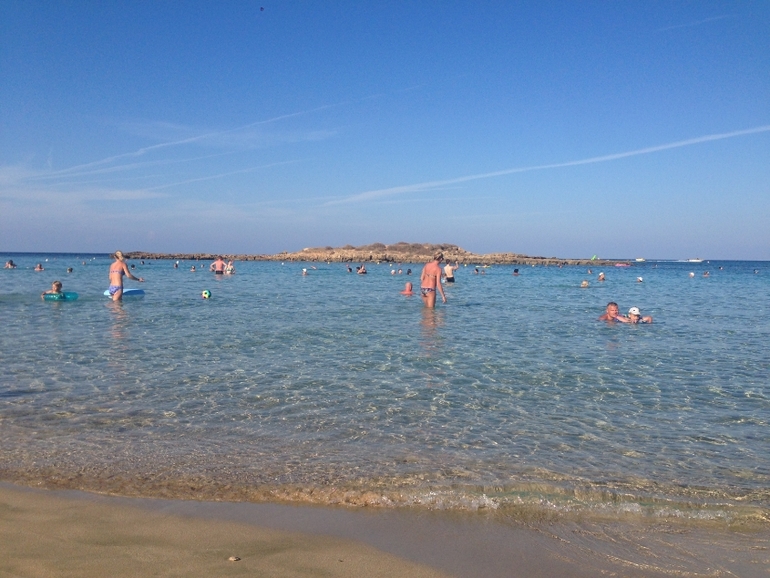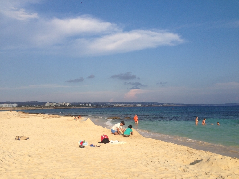 Мы выехали около 11 утра, доехали до пляжа Ларнаки Финикудес. Это такая большая лужа)) песок там и не песок, а вроде глины с песком. Т.е. он плотный, лепится, не прилипает почти. Мне там совсем не понравилось, а вот дети были в полном восторге.