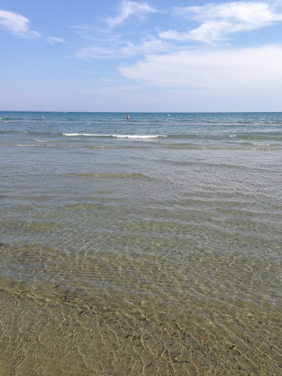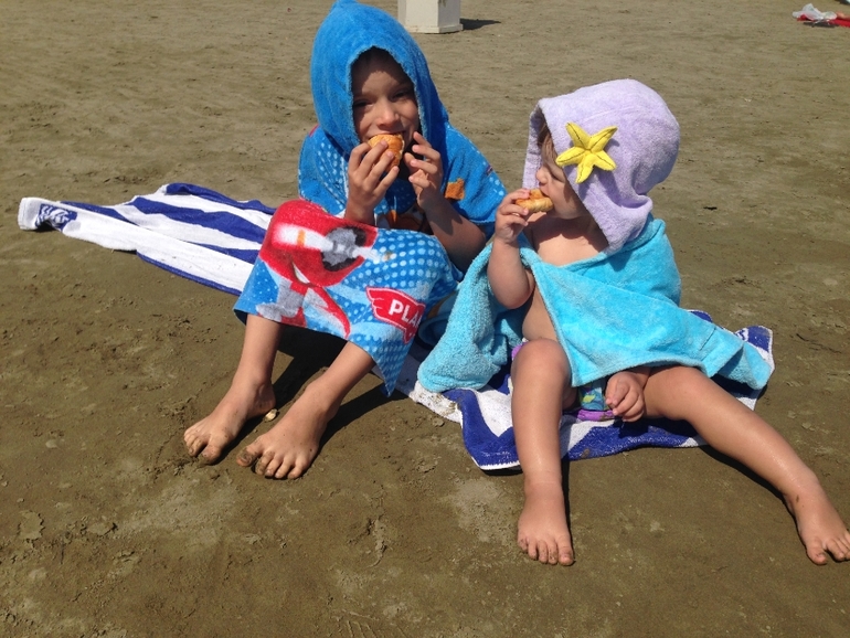 на пляже лежаки-зонты платные, по 2,5 евро за единицу. Но вполне можно разместиться и на полотенцах и со своим зонтом.