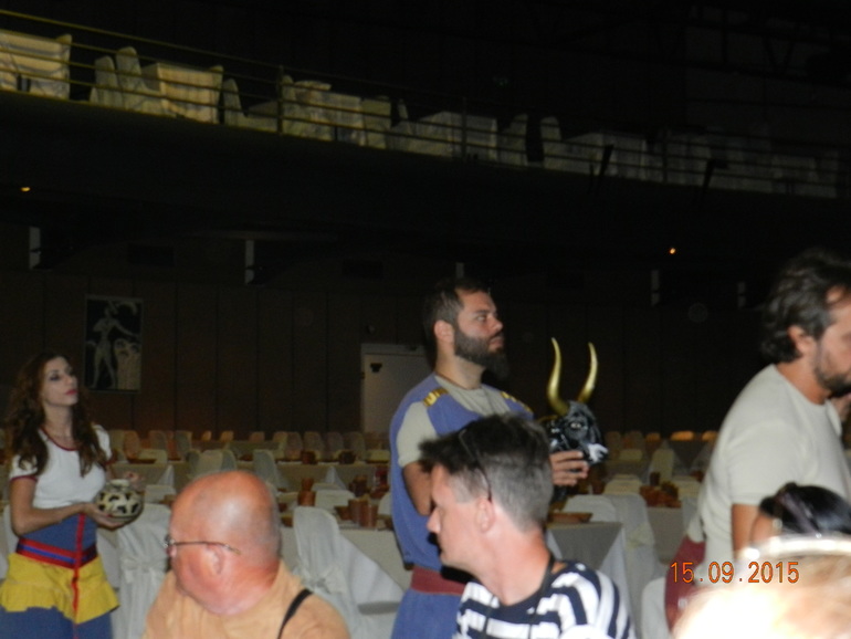 Нас посадили за столы и началось представление на сцене, на экранах в это время бежал поясняющий текст на английском, греческом и русском.