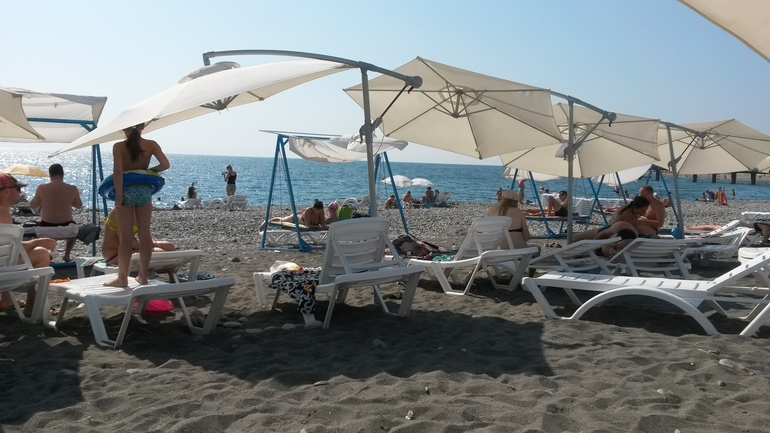 Пляж расположен в пяти-семи минутах ходьбы от отеля. Пляж у отеля свой, но могут размещаться и гости за дополнительную плату. Постояльцам шезлонги, зонты и полотенца бесплатны. Пляж, как и море чистые. Вода теплая и прозрачная. Единственное, пляж галечный, поэтому нужно привыкнуть к заходам-выходам из моря, либо прикупить специальные тапочки для плавания и спокойно заходить в море.