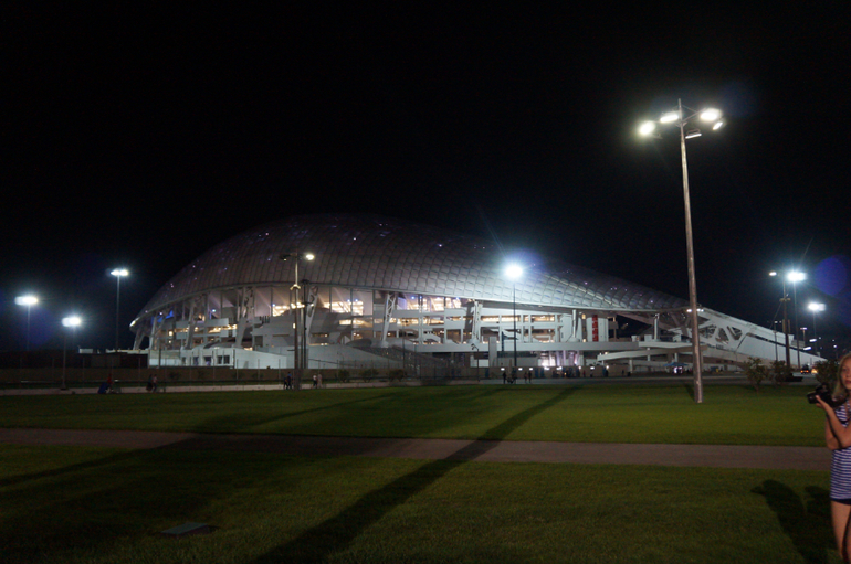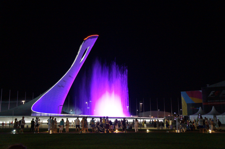 Богатырь расположился прямо под боком Олимпийского парка. Мы любили гулять там по вечерам. Парк красочно освещается фонарями. Вечером там проходит необыкновенно- красивое шоу танцующих фонтанов прямо под олимпийским факелом. Один восторг, что тут скажешь!