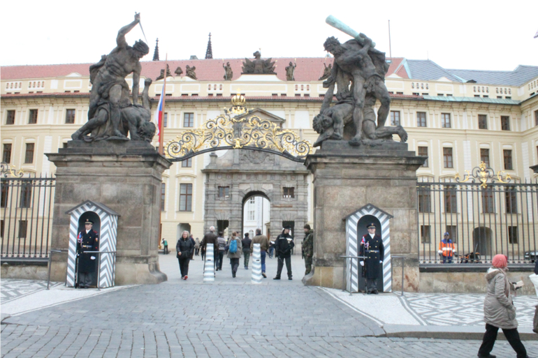 Резиденция президента Чехии, там как и у нас стоит караул, мы попали как раз к 12 часам на смену караула