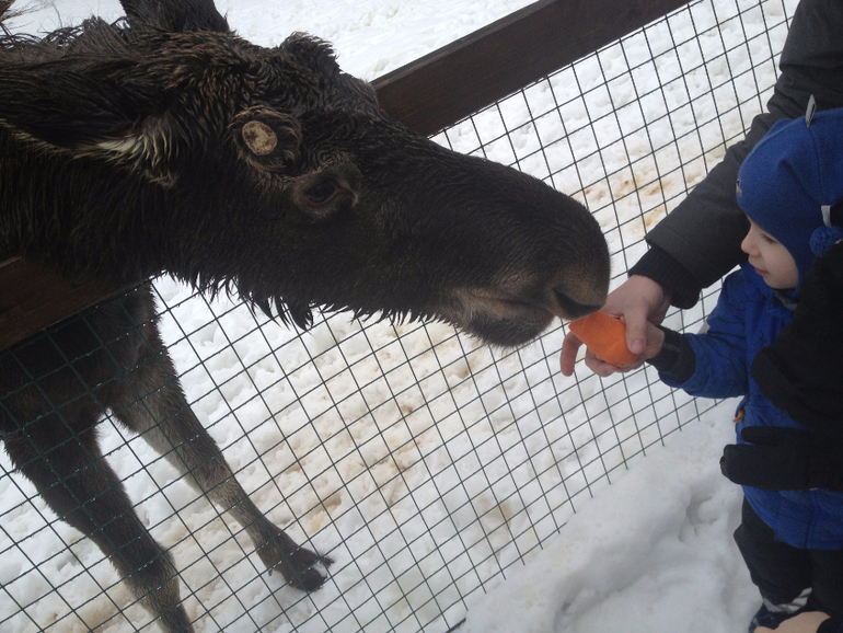Дети с удовольствием кормили лосей. От оленей быстро отвлеклись - стали снеговика лепить :))))) Ну а Мишке больше всего, кажется, понравились ворота, которые открывались с пульта. Не биолог растет:)