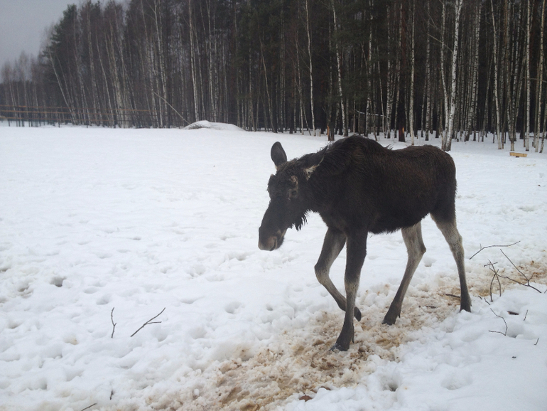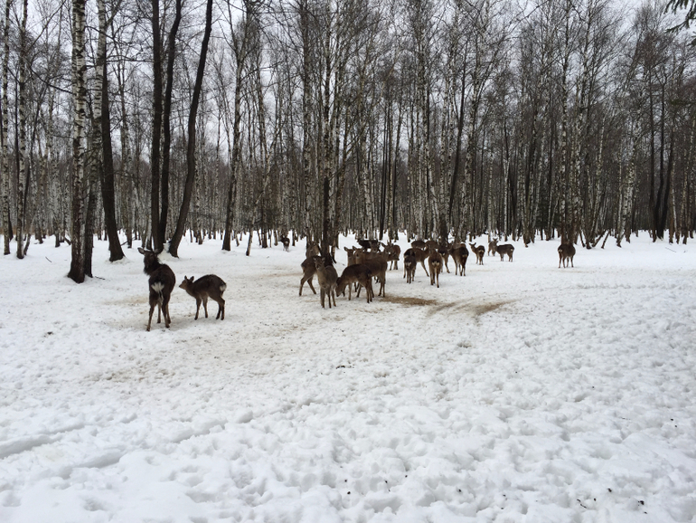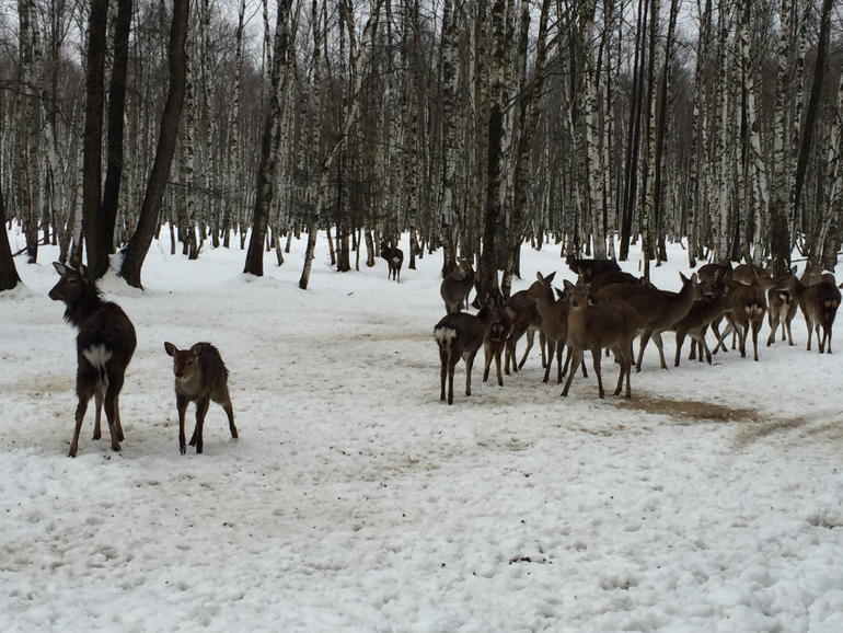 Сейчас на биостанции живут два молодых лося (чуть больше года), их выходили с младенческого возраста и собираются выпускать в природу. И старая лосиха Малышка (в холке сантиметров 170:))), которая выросла на биостанции, живет в лесу, а зимовать приходит в родную вольеру. По территории бегает свободно небольшая семья оленей. В отличие от лосей, которые даются гладить, едят из рук), олени к людям не подходят. Еще нас сводили в лес на подкормочную площадку (метров 300 от биостанции), туда приходят кормиться дикие олени. Когда мы подошли, там было их штук 20, от вожаков-рогачей до оленят прошлого лета. Очень впечатляет - увидеть оленя в природе большая редкость. А тут и не зоопарк, и животные так близко!
