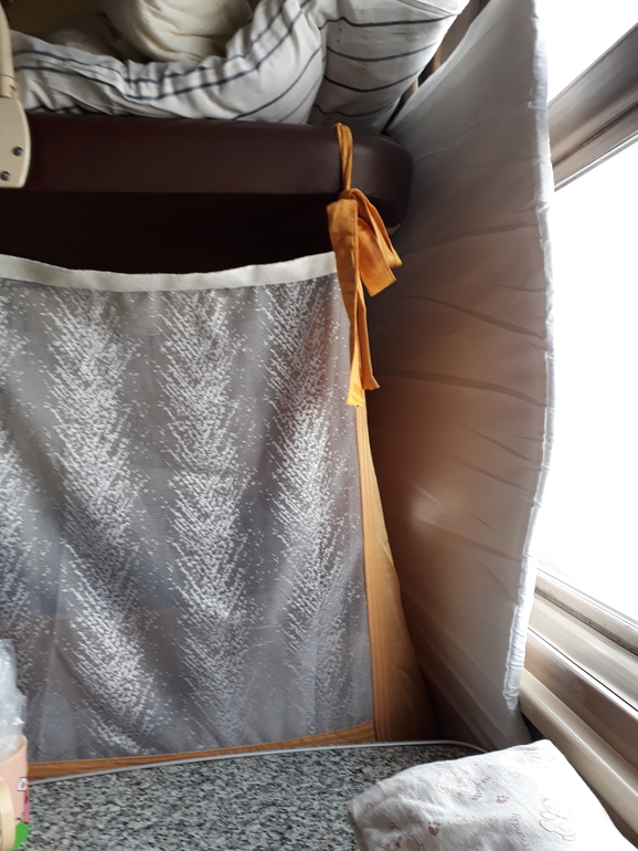 2) вагон старый. В потолке прямоугольная дырка, чуть ниже железный прямоугольник выступающий, который типа вид создает приличный. Скотчем не получилось, поэтому просто взяла "государственную" одеялку и потихоньку планомерно всунула ее полностью в эту дырку, думала не войдет, ан нет, уместилась, даже смотрелось аккуратно. Но есть косяк....вынимать нужно тоже аккуратно....муж дернул ее резко и потолок отвалился))))))) пришлось проводников звать что бы своим ключом опять конструкцию закрывали)))) они конечно не обрадовались))
