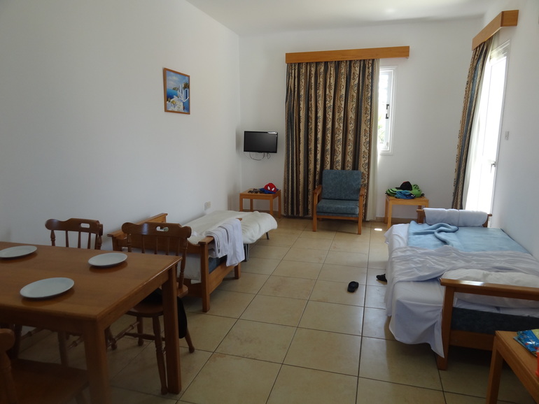 В этот отпуск отдыхали с 18 по 31 мая в апарт-отеле Maistrali Apts в Протарасе. Отель звездности не имеет, но по уровню сравним с 3*. Очень удачно расположен, на небольшом выступаюшем мысе, между самым известным песчаным пляжем Протараса Fig Tree Bay и маленькой каменистой бухтой с лазурной водой, где очень приятно поплавать с маской и посмотреть рыбок рядом с берегом.
