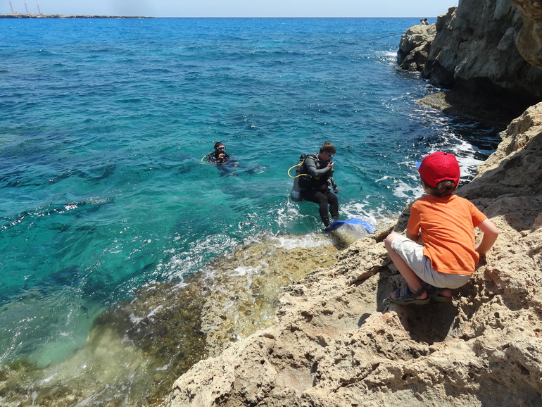 Папа наш по традиции занялся дайвингом, а мы его сопровождали и ожидая исследовали скалы мыса El Greco: