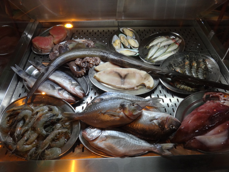 У туроператора мы заказывали тур с питанием завтраки-ужины, поэтому готовили в номере только в обед. Кстати, это первый отель на Кипре, где нельзя поменять ужин на обед, обычно мы так всегда делали и ужинали в ресторанах города. Тут отель такой возможности не дает. Но учитывая достаточно скромный выбор блюд на ужин, мы все-таки в отеле их иногда пропускали. Средний ценник на ужин в ресторане у нас выходил около 40 евро. Выбор рыбы в местных ресторанах: