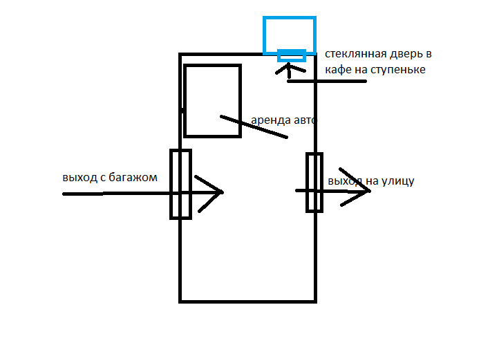 5. после регистрации ей идти в середину зала, там нет дверей, просто широкий проход в другой зал. Думаю у нее будет зона С или D. В проходе будет стойка информации, пусть попросит сотрудников показать куда ей идти.