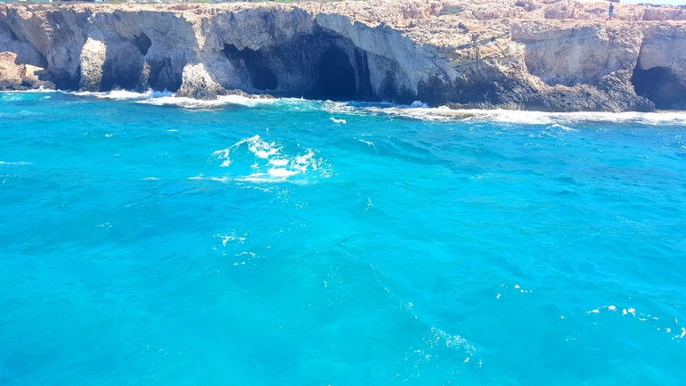 До того, как мы обогнули мыс Каво Греко, нашу яхту достаточно сильно раскачивало на волнах. У Вари началась "морская" болезнь, чуть позже к дочери присоединилась я. Экскурсовод спасала нас специальными гомеопатическими таблеточками. За мысом нас ждал полный штиль. Мы пришли в себя и продолжили любоваться красотами кипрского побережья.Это нам уже получше)
