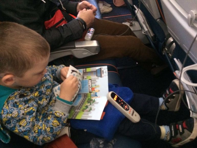 Можно выбирать разные каналы. Матвей смотрел мультики, а я фильмы. Ещё Матвею вручили сумочку с наклейками, карандашами, раскраской и смешной шапкой.