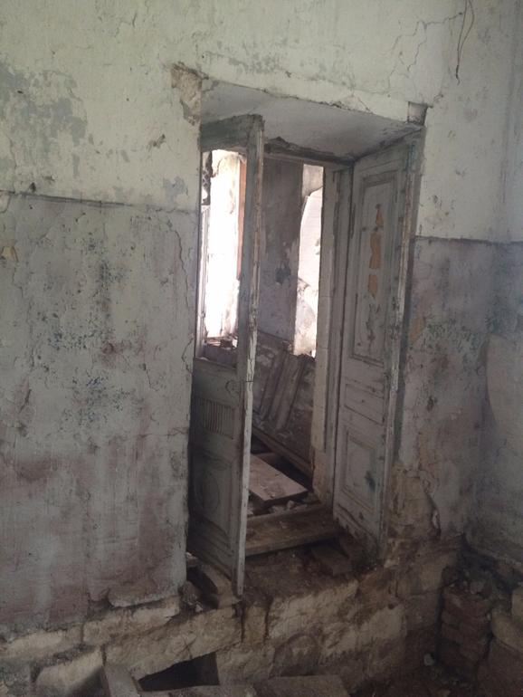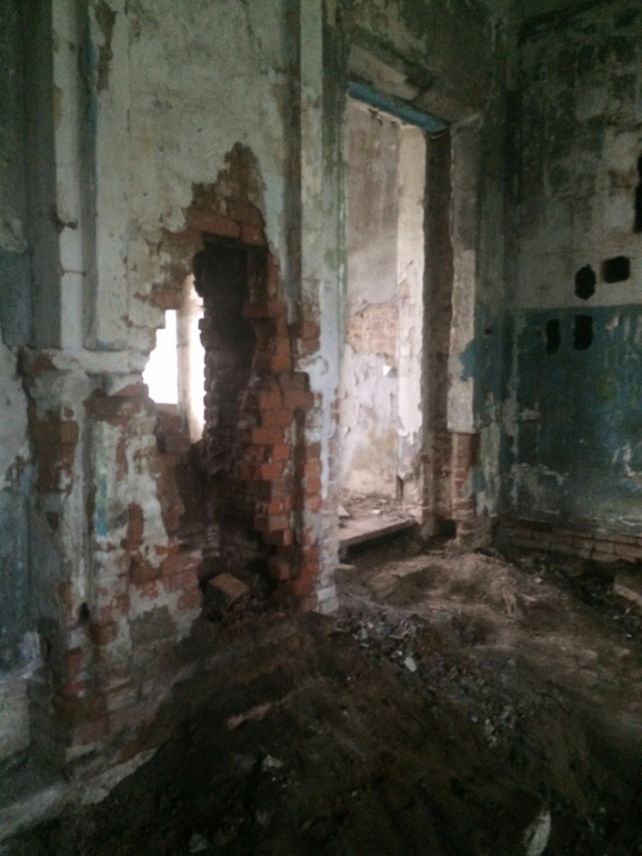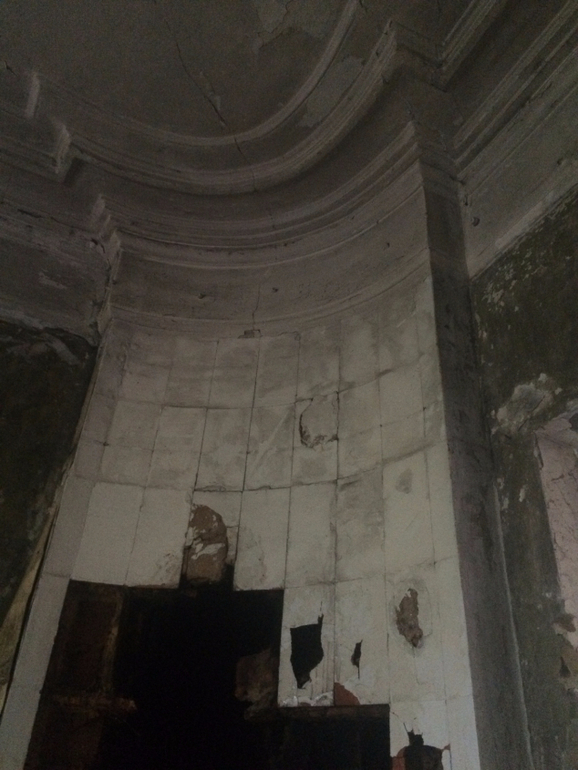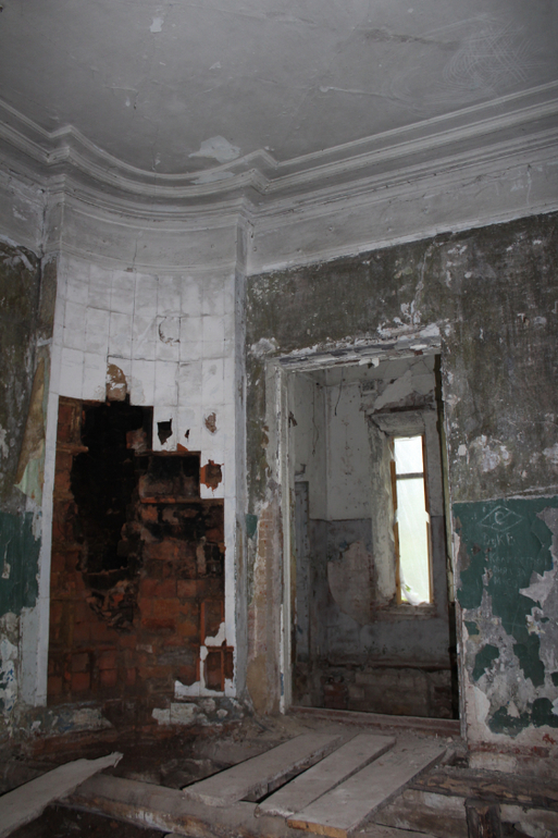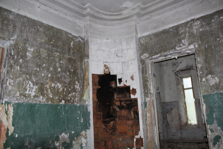 В доме полная разруха, развалины все печи и камины, про полы я уже написала, на стенах облупившаяся штукатурка, в обрамлении потолков еще сохранилась лепнина.