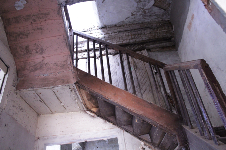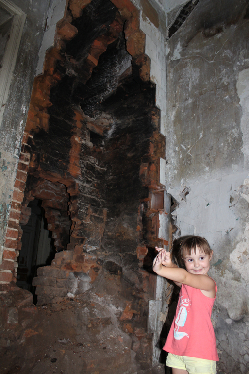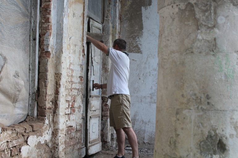 Здесь надо быть очень осторожными, потому что нет полов, приходиться ходить по балкам и в некоторых местах готов обвалиться потолок.