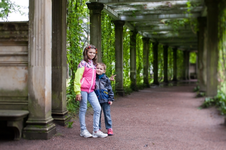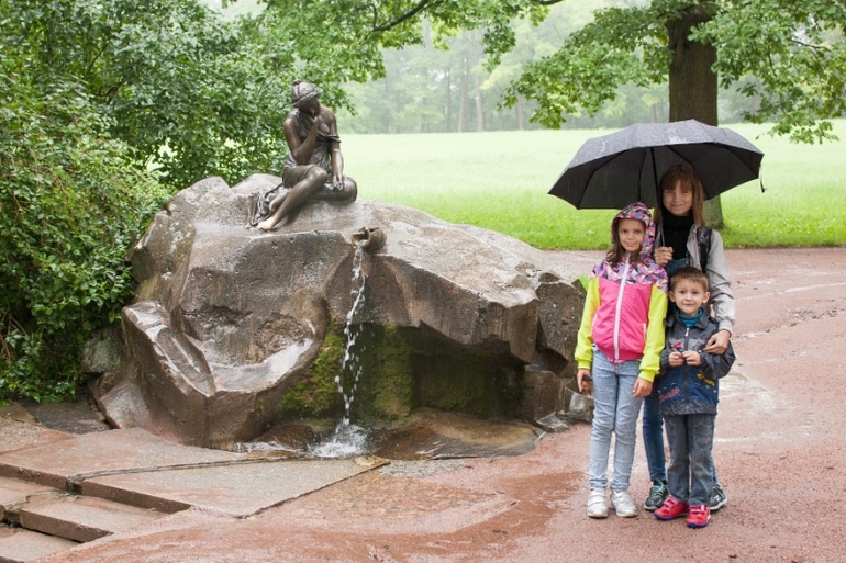 Добрались до парка быстро, погода была хмурой. Мы успели немного погулять по парку, а потом начался дождь. Пришлось заканчивать прогулку уже с зонтиками.