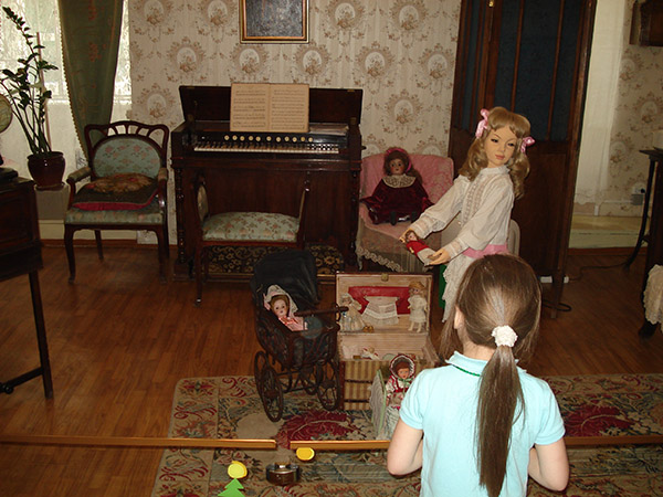 Экспозиция "В гостях у прабабушки" знакомит с интерьером детской комнаты XIX-XXвв. Там представлены настоящие предметы мебели, домашнего обихода и игрушки, которых было совсем не много!