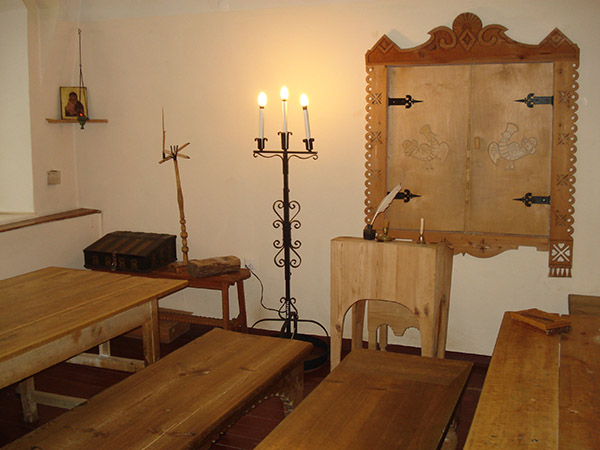 Зале "Старорусская школа" знакомит с обстановкой школы, правилами поведения, уроками. В сводчатом зале стоят скамьи, выставлены древние книги, плакаты с церковно-славянским алфавитом и славянским счислением.