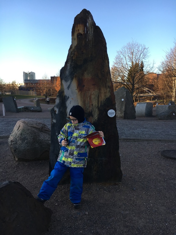 Во второй день мы решили посетить интерактивный музей Эврика. Находиться он в пригороде ХСК, в Тикурилле. Опять же, сев на электричку, мы за 15 мин доехали на станцию. От станции до Музея идти мин 10. Перед входом расположена экспозиция камней, родители читают что это за камни, для детей просто препятствия, чтобы полазить)) .