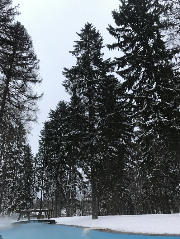 Это невероятные ощущения 👍🏻 плыть в теплой воде, когда вокруг тебя покрытые снегом сосны и елки 😌✨ пар движется над поверхностью воды 😅