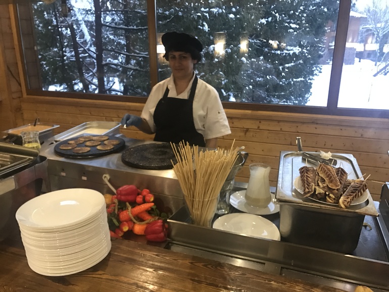 Утром было 2 вида кашки, готовили глазунью, оладьи и невероятные вафли.