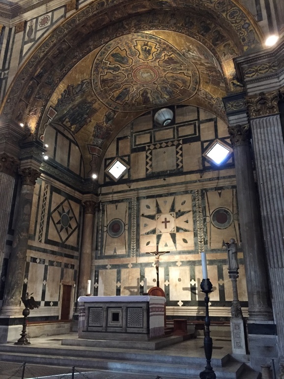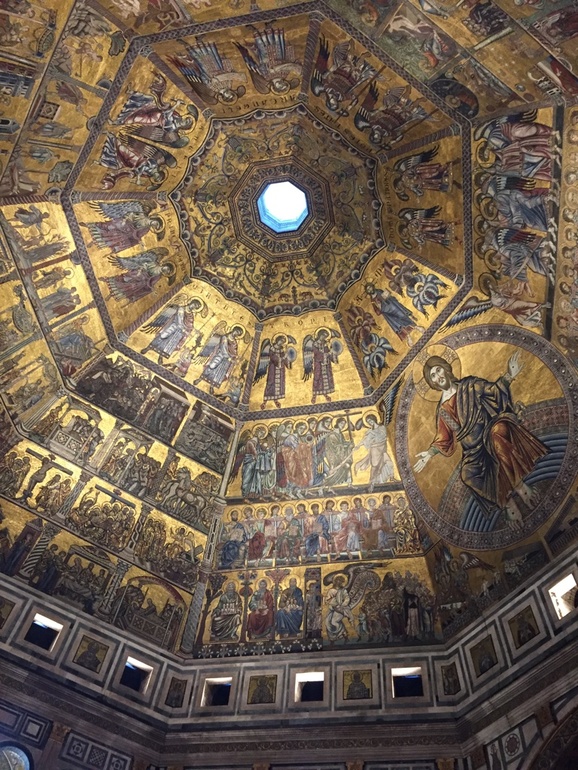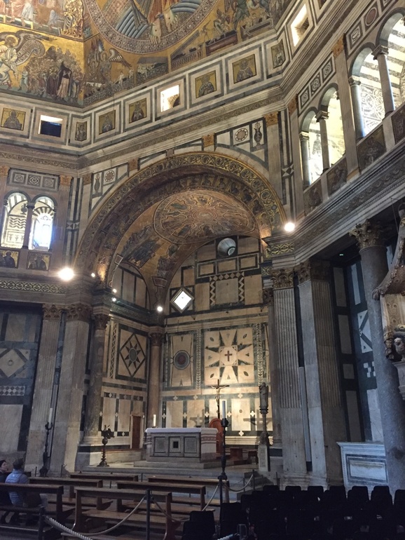Зашли внутрь по билету, который покупали накануне. Очень красиво внутри! Все в расписи и мозаике! Убранство даже интересней, чем в Дуомо Санта-Мария-Дель-Фьоре.
