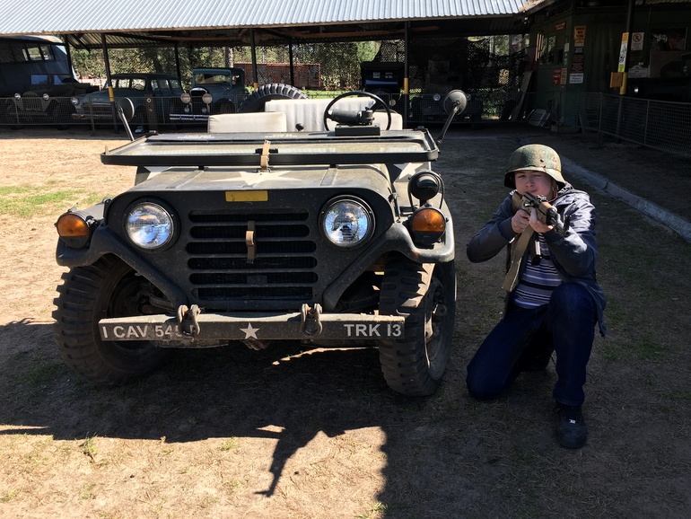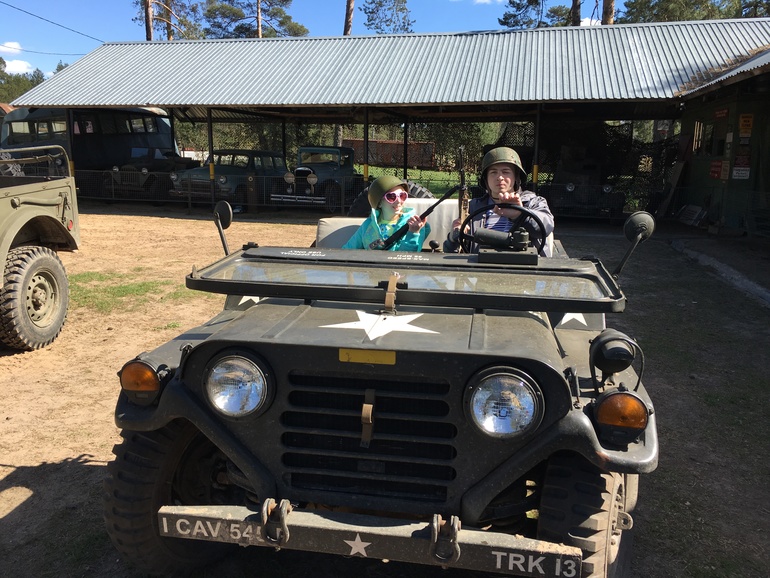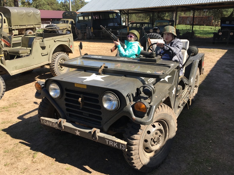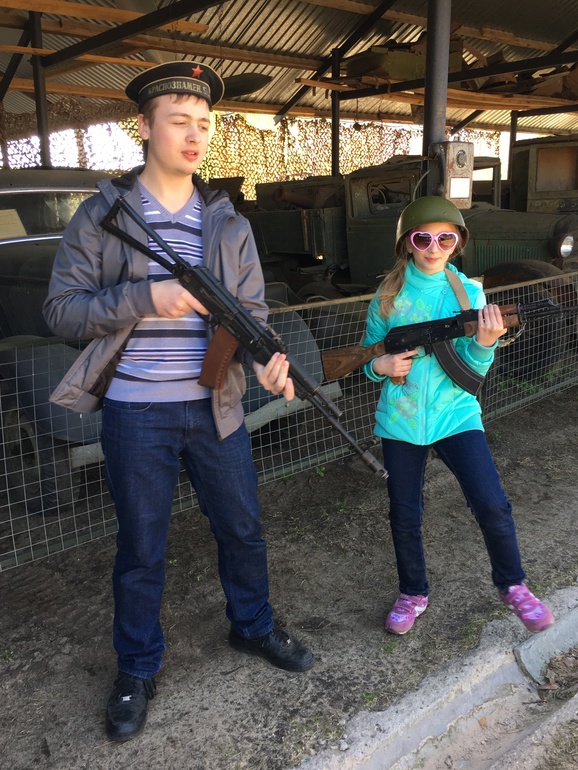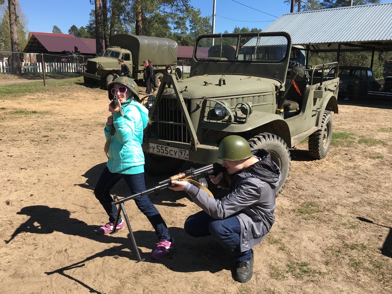 Здесь предлагается военная одежда, каски, можно было надеть это всё, посидеть в машинах. Чем наши дети и занялись) Начали скромненько