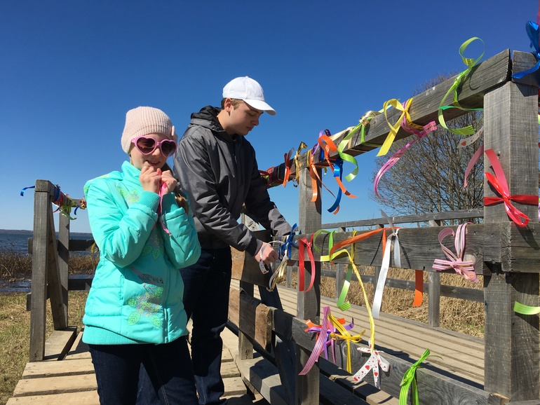 По деревянному настилу прошли к озеру. Подходим к Синему камню и тут дочка вспомнила, что ленточки свои, "заряженные" на желания она оставила в машине
