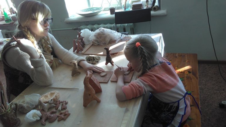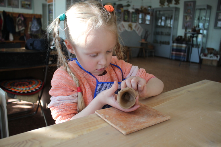 На вторую половину дня оставался музей Петровской игрушки с мастер-классом по лепке из глины свистулек. Очень интересное место для детишек, экскурсовод с увлечением рассказывала историю петровской игрушки, как и для чего они создавались, про преемственность поколений. С этой же девушкой Катя лепила свистульку, очень непростое дело, но дочка справилась. Попросила нашу учительницу по рисованию, чтобы помогла теперь её раскрасить.