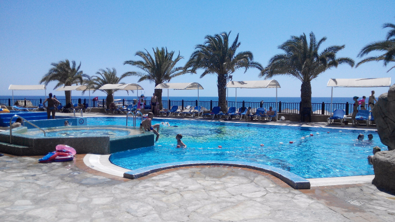 Про бассейны: их много! Четыре штуки. Бассейны есть глубиной и 30 см, и 80 см, и два метра. На любой вкус :-) народу немного. Бассейны чистят, вода хлорированная. Две длиннющие горки (муж так и не рискнул съехать, а я разок прокатилась)))). Совсем мелкий бассейн (30 см) с тремя маленькими горками.