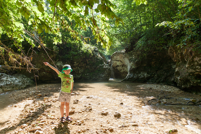 На следующее утро мы оправились по уже знакомому нам маршруту к водопадам Руфабго. Это каскад из 16-ти водопадов, вдоль которого оборудован экскурсионный маршрут. К первым пяти пройти просто, до остальных - сложнее. С детьми мы не стали рисковать. Рано поутру там было очень здорово! Прохлада ручья и тень деревьев, очень красивая и простая прогулка. Костик и в прошлый раз сам прошел по этому маршруту, поэтому сейчас даже почти не капризничал.