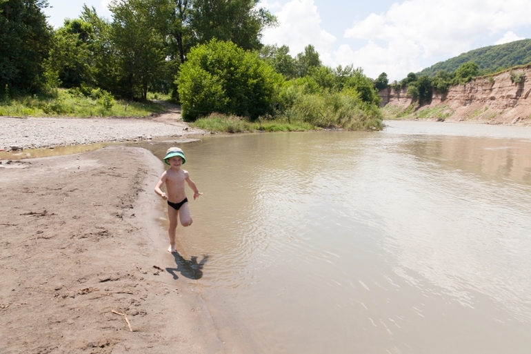 Погуляв там не очень долго, мы поехали к реке. Вот где было прохладно!) Теплая погода установилась в этих местах совсем недавно (как раз с началом нашего отпуска), поэтому вода в реке Белой была ледяной. Дети искупаться не рискнули, а вот наш папа, конечно же, купался. Потом мы перекусили и поехали в Хамышки.