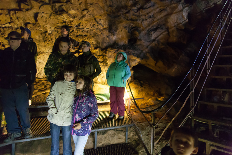 У пещеры людей почти не было. Нас это удивило - в августе здесь уже с утра толпился народ. Но все было нормально - пещера открыта, экскурсии водят. Нам повезло, что одновременно с нами на экскурсию отправились школьники-туристы из Петербурга. Потому что долго ждать, пока соберется группа (а группы там набираю большие), не хотелось.
