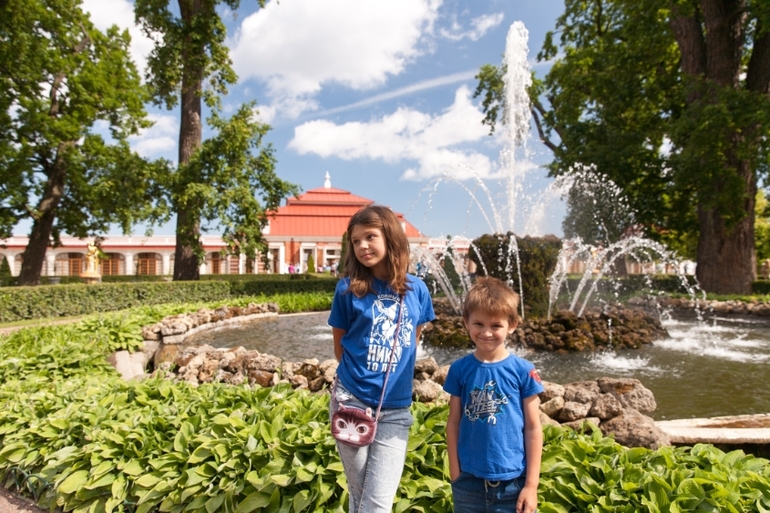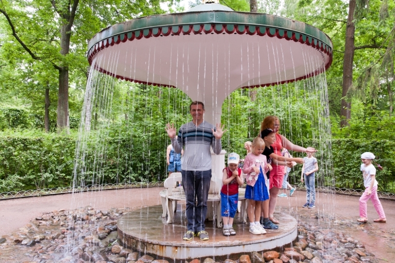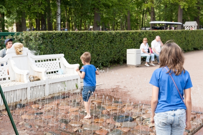 На этот раз мы ехали туда на метеоре (жаль только, что сразу не отправились от причала Водохода, другая компания оказалась очень неспешной). Там мы гуляли, собирали ракушки на берегу, любовались на фонтаны, посетили Монплезир, вольеры с птицами и Эрмитаж (посмотрели на интересный стол), а еще дети с удовольствием искупались в фонтанах-шутихах!