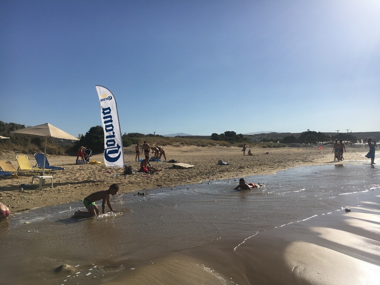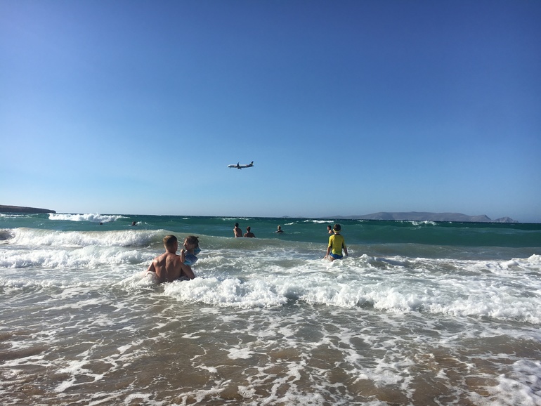 Очень понравился пляж Karterou около аэропорта . Пляж обустроен, душ, раздевалки, туалеты. Зонтики бесплатно, лежаки платно. Есть детская площадка. В день, когда мы были, погода ухудшилась, был ветер и сильные волны. Но моих это не остановило)