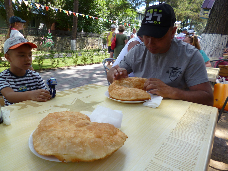 Питались в основном в столовках(разных)),например на Центральном пляже кафе "Бриз"комплексный обед -200руб.,столовая СССР (цены очень хорошие ,вчетвером наедали (у меня все мальчики,три штуки))))на 1000-1200.Ну и перекусов (в виде популярных огрооомных чебуреков,вкуснючих до невозможности ...(80р.)-валом